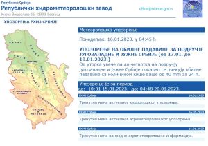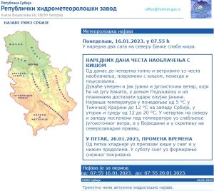 Kasnije posle podne na severozapadu, a uveče i u ostalim predelima prestanak padavina uz istovremeno smanjenje oblačnosti u severnim, zapadnim i centralnim predelima Srbije.