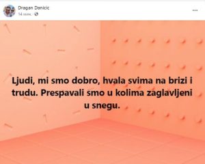 – Ljudi, mi smo dobro, hvala svima na brizi i trudu. Prespavali smo u kolima zaglavljeni u snegu – napisao je Dragan na svom profilu na društvenim mrežama.