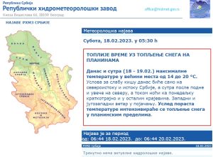 Danas i sutra, 18. i 19. februara maksimalne temperature u većini mesta od 14 do 20 stepeni. Uslova za slabu kišu danas biće samo na severoistoku i istoku Srbije, a sutra posle podne i uveče na severu, a tokom noći ka ponedeljku kratkotrajno i u ostalim krajevima. Zapadni i jugozapadni vetar u pojačanju. Usled porasta temperature intenziviraće se topljenje snega u planinskim predelima, najavio je Republički hidrometeorološki zavod.