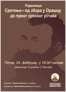 Radionica pod nazivom Sretenje – od zbora u Orašcu do prvog srpskog ustava biće održana u petak, 24. februara u 18 sati u prostorijama ogranka Fondacije „Svetozar Miletić“ u Pančevu.