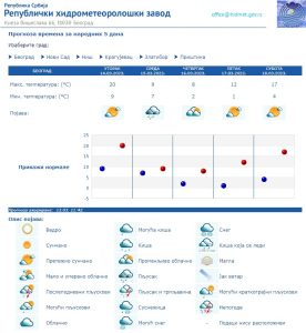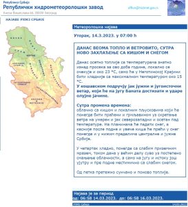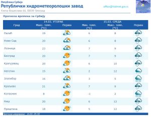 U sredu, 15. marta biće oblačno sa kišom i lokalnim pljuskovima, koji će ponegde biti praćeni i grmljavinom uz skretanje vetra na umeren i jak severozapadni i osetan pad temperature. Na planinama će padati sneg, a kasnije posle podne i uveče kiša će preći u sneg ponegde i u nižim predelima centralne i južne Srbije.