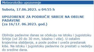 „Obilnije padavine danas se očekuju na istoku i jugoistoku Srbije (od 20 do 30 mm, lokalno i više). U ostalim krajevima slablјenje, a posle podne i uveče prestanak kiše. Na istoku i jugoistoku padavine će prestati u nedelјu do sredine dana“, navodi se u upozorenju RHMZ.
