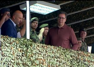 Predsednik Srbije Aleksandar Vučić u Vojnom kompleksu „Pasuljanske livade“ prisustvuje pokaznim gađanjima u okviru završne faze obuke pripadnika Vojske Srbije sa novouvedenim naoružanjem i vojnom opremom.