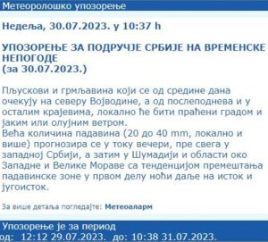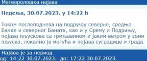 „Plјuskovi i grmlјavina koji se od sredine dana očekuju na severu Vojvodine, a od poslepodneva i u ostalim krajevima, lokalno će biti praćeni gradom i jakim ili olujnim vetrom.