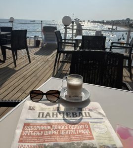 Na ovoj fotografiji, zabeleženoj u trenutku, oseća se miris slane morske vode i toplina sunca koje obasjava sve oko sebe. Na stolu ispod nežnog suncobrana, kao simbol savršenog trenutka, stoje kafa i nedeljnik „Pančevac“.