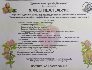 – Otvaranje je zakazano za 10 sati. U kulturno–umetničkom delu programa učestvovaće deca nižih razreda osnovne škole, a neki od njih će napisati i pesme ili kratke sastave o jabuci. Nastupiće i folklorna grupa KUD-a „Sveti Sava“ iz Crepaje, kao i tamburaški orkestar KUD-a „Sveti Sava“. Članovi neformalne organizacije „Banatska petica“ će čitati poeziju i prozu, a biće pozvan i specijalan gost, Duško Genc, koji piše prozu – kaže Jasmina Isajlov iz Udruženja žena „Vidovdan“.