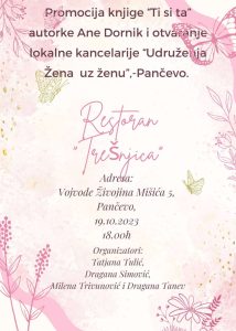 Otvaranje lokalne kancelarije Udruženja „Žena uz ženu“ biće priređeno u četvrtak, 19. oktobra u 18 sati, u restoranu „Trešnjica“ u Pančevu. Na ovoj svečanosti biće predstavljena i knjiga „Ti si ta“ autorke Ane Dornik.
