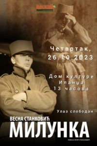 Nakon Svečane akademije, u 13 časova biće izvedena monodrama o junakinji Milunki Savić, koju će izvesti talentovana glumica Vesna Stanković.