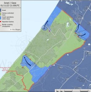 Izraelske odbrambene snage napreduju kroz pojas Gaze, napredujući prema samom gradu Gazi sa tri strane. To proizilazi iz mape izraelske ofanzive objavljene na internetu.