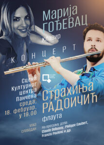 U okviru muzičkog programa Kulturnog centra, 18. februara u 19 sati na Sceni, na programu je koncert Strahinje Radoičić (flauta) i Marije Gođevac (klavir). Na programu su dela: Claude Debussy, Philippe Gaubert, Francis Poulenc i dr. Ulaz je besplatan.