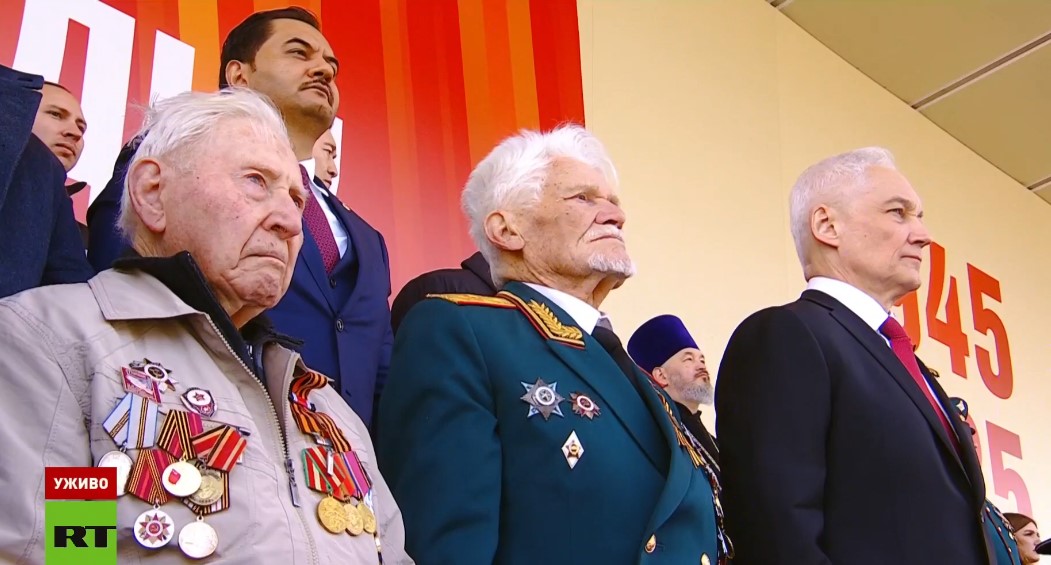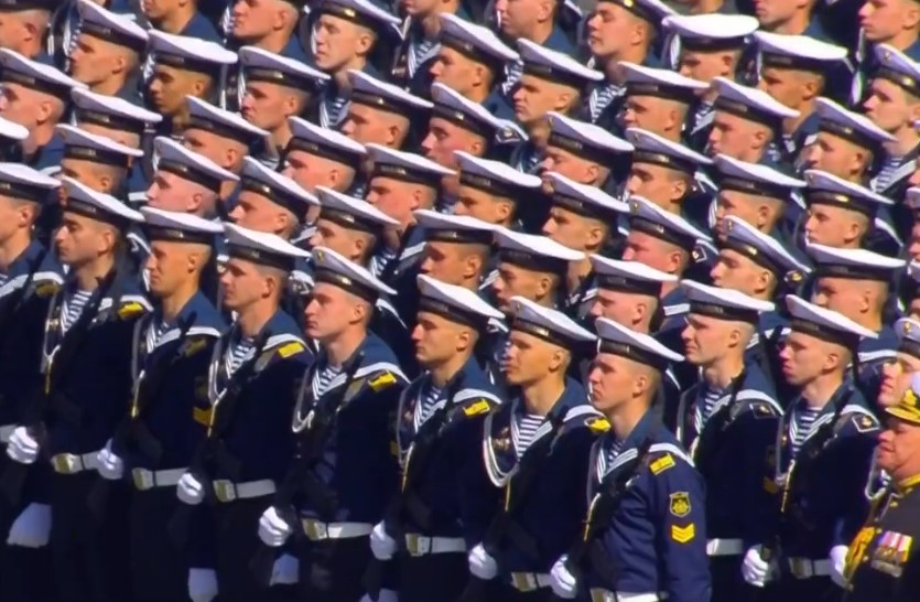 Završen je govor predsednika Rusije. Intonira se himna Rusije Federacije. Paradne jedinice u uniformama iz Drugog svetskog rata marširaju kaldrmom.