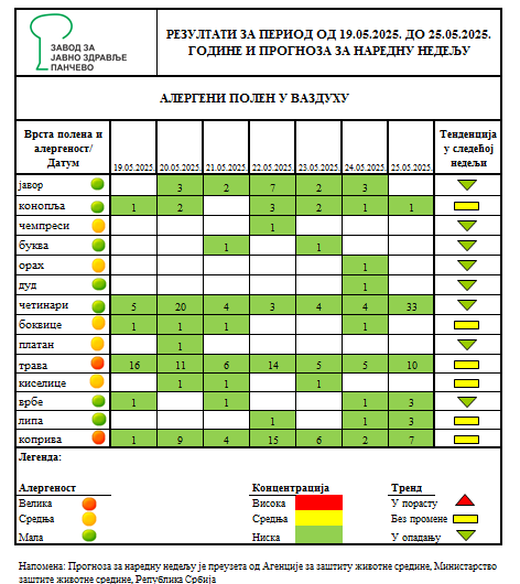 U dvadesetojprvoj kalendarskoj nedelji, od 19. do 25. maja, u vazduhu Pančeva detektovane su niske koncentracije polena svih biljaka. Za ovu nedelju prognozirano je opadanje polena javora, čempresa, bukve, oraha, duda, četinara, platana i vrba, dok će ostale vrste polena biti u stagnaciji, saopštava pančevački Zavod za javno zdravlje.