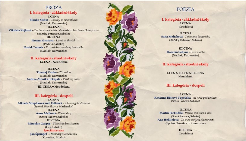 Na šestom književnom konkursu nagrađeni su i učesnici iz opštine Kovačica. Pravo učešća imali su Slovaci iz Mađarske, Rumunije, Bugarske, Hrvatske, Srbije, kao i Slovaci koji žive u Slovačkoj a potiču iz pomenutih zemalja
