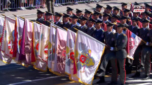 Komandant parade je tražio od predsednika dozvolu za početak parade, što je Vučić odobrio. Učenici Vojne gimnazije i stručnih škola nose zastavu Srbije dugu 300 metara i tešku 300 kilograma. Veličanstvenu zastavu mogu videti svi počasni gosti kao i svi u publici. Intonirana je hima Srbije “Bože pravde”.