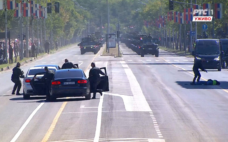 Podsetimo, vojna parada je danas počela počasnom artiljerijskom paljbom pripadnika Garde iz šest oruđa sa deset plotuna i iznošenjem zastave Srbije dugačke 300 metara, koju su nosili kadeti Vojne akademije i učenici Vojne gimanzije i Vojne stručne srednje škole. U svečanom stroju se po prvi put našla konjička jedinica Garde.