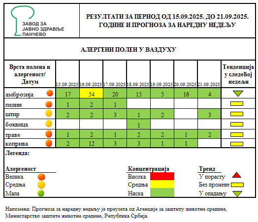 U 38. kalendarskoj nedelji, od 15. do 21. septembra, u vazduhu Pančeva izmerene su srednje koncentracije polena ambrozije, izveštava pančevački Zavod za javno zdravlje. Za ovu sedmicu prognoziran je dalji pad koncentracije ovog polena dok će ostale vrste stagnirati.