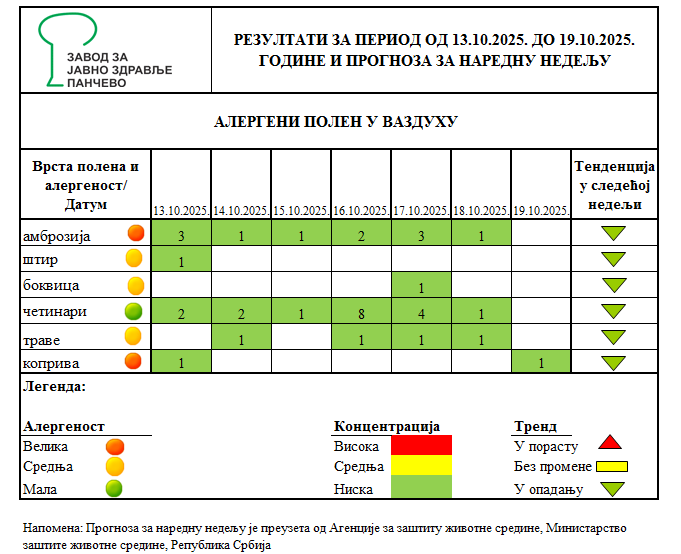 U 42. kalendarskoj nedelji, od 13. do 19. oktobra, u vazduhu Pančeva merni uređaji Zavoda za javno zdravlje zabeležili su niske koncentracije polena ambrozije, štira, bokvice, četinara, trave i koprive. Za ovu nedelju prognoziran je dalji pad koncentracije polena svih biljaka koje još cvetaju.