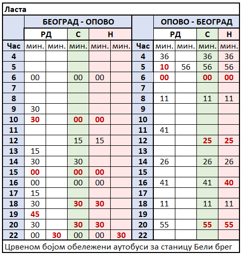 A od Opova do Beograda stiže se „Lastom”. Zarana, oko pola 5, kreće prvi autobus. Ali iz Beograda se očigledno na rad ne dolazi do Opova, pa je prvi prevoz iz glavnog grada tek u 6 sati, a sledeći u pola 10. Ipak, kako svedoče naši sagovornici, javnim prevozom koriste se, uglavnom učenici, studenti i radnici. Izletnici i namernici stižu do Opova stižu i iz Opova odlaze svojim automobilima.