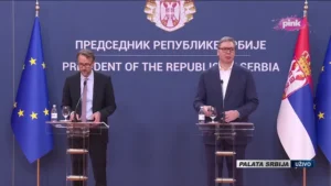 Printscreen/TV PinkPredsednik Srbije Aleksandar Vučić i ambasador Evropske unije u Srbiji Andreas fon Bekerat obratili su se iz Palate Srbija, nakon sastanka na kojem je predsedniku uručen godišnji izveštaj Evropske komisije o Srbiji 2025.
