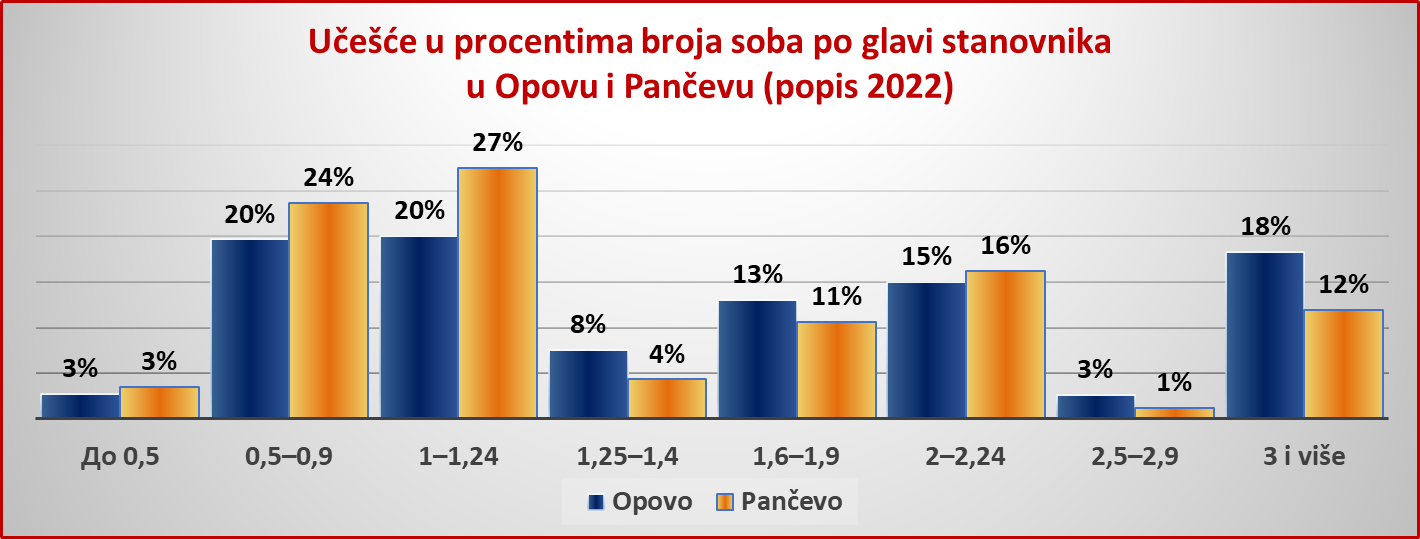 Statistika o broju soba po glavi stanovnika neke kuće pokazuje i da Opovčani raspolažu mnogo većim komforom od Pančevaca. Jer, ako neko ima pola sobe na raspolaganju, to znači da bar dvoje ljudi mora da se smesti u jednu prostoriju, gde će spavati, jesti, gledati televiziju, primati goste…. Ako bi, na primer, muž i žena imali i spavaću sobu i dnevnu, to bi značilo da imaju bar jednu sobu po glavi stanovnika stana. A gde je tu još trpezarija? Kuhinja i kupatilo se ne računaju u ovom zbiru.