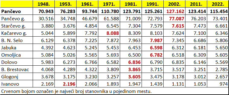Takođe, nema dileme da se broj stanovnika u pojedinim selima počeo smanjivati i pre početka novog milenijuma (videti tabelu). Prvo je posustalo Ivanovo, počev već od 1953. godine. Kačarevo će na popisu 1971. godine imati najveći broj stanovnika – 8.088, što je i rekord kada su sela u pitanju. Ni do dan-danas nije ga stiglo ni Starčevo, koje od popisa 2011. godine nosi titulu najvećeg sela u Pančevu. Izvinjavamo se pritom i Starčevcima i Kačarevcima što takođe za potrebe novinskog članka mesto njihovog življenja nazivamo selom, a ne gradskim područjem, kako ih sada tretira i Republički zavod za statistiku. Jer i to je stvar nove metodologije. Pored toga, teško da ima nešto uvredljivo kada se kaže selo, jer uskoro ćemo tamo, kako nam se grad razvija, izgleda svi želeti da živimo.
