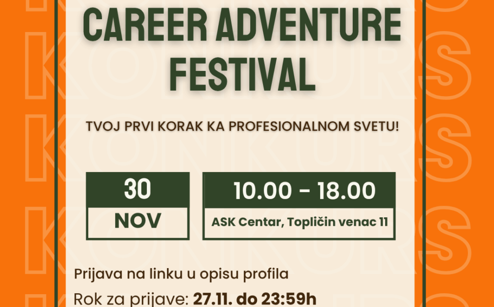 Mladi koji žele da učestvuju mogu se prijaviti odmah na linku , jer je broj mesta ograničen. Career Adventure Festival održaće se 30. novembra u ASK Centru, od 10 do 18 časova.