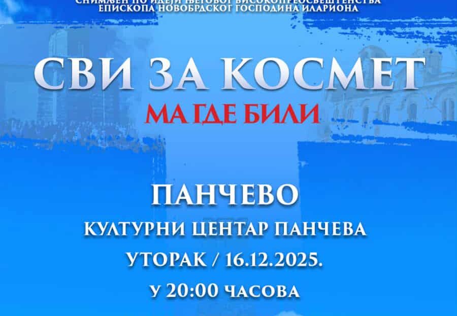 Humanitarna projekcija filma“Svi za Kosmet, ma gde bili“ održaće se 16. decembra u 20 časova u Kulturnom centru u Pančevu. Ulaz je slobodan a donacije su dobrovoljne.