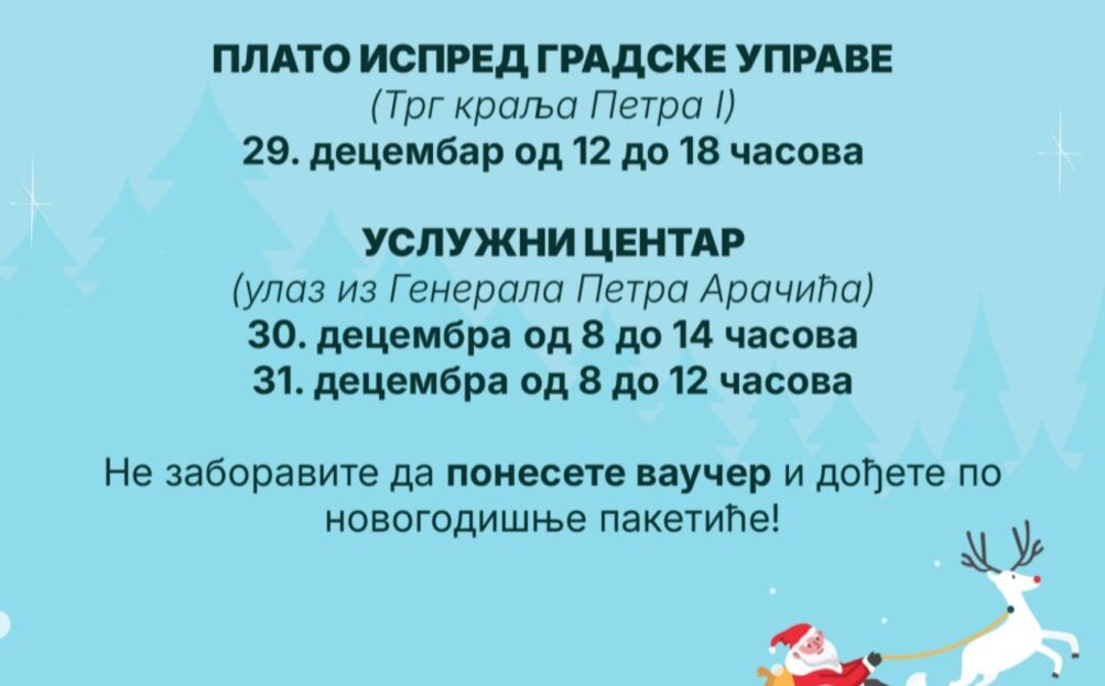 Na Trgu kralja Petra I 2-4, 29. decembra, od 12 do 18 sati, deci će biti podeljeni novogodišnji paketići – poklon Grada Pančeva. Dovoljno je poneti vaučere koji su mogli da se preuzmu do prošle nedelje i uzeti darove.