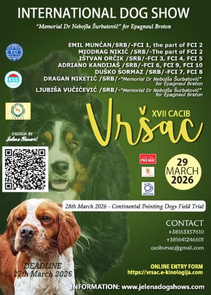 The Kennel Club Vršac iz Vršac organizuje međunarodnu izložbu pasa CACIB Vršac, koja će biti održana 29. marta 2026. godine. U okviru manifestacije biće održan i Memorijal Dr Nebojša Šurbatović memorial za rasu Epagneul Breton.