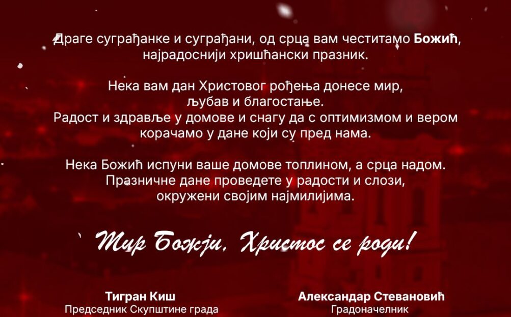 U ime grada Pančeva i lično ime, Aleksanda rStevanović, gradonačelnik i Tigran Kiš, predsednik Skupštine grada svim sugrađankama i sugrađanima žele srećan Božić.