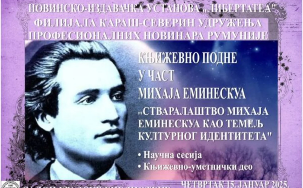 Gradska biblioteka Vršac, Novinsko-izdavačka ustanova „Libertatea” i Filijala Karaš-Severin Udruženja profesionalnih novinara Rumunije, organizuju Književno podne posvećeno Mihaju Eminesku – „Stvaralaštvo Mihaja Emineskua kao temelj kulturnog identiteta”.