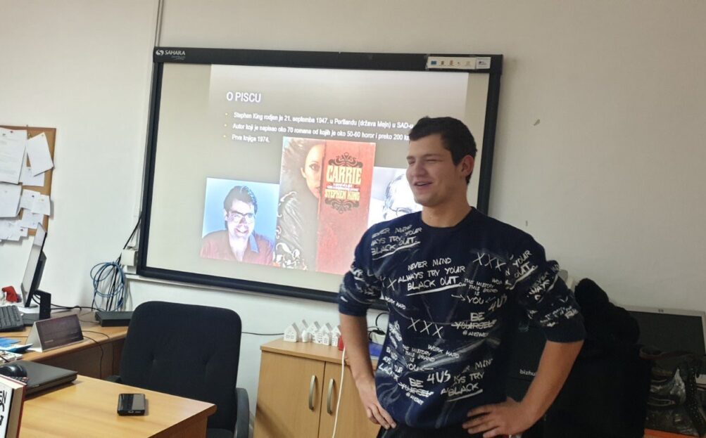 Uzorni učenik odeljenja III-3, David Badovinac, u prostorijama Hemijsko-medicinske škole Vršac upoznao je svoj razred i ostale posetioce sa svojim omiljenim autorom – Stiven King – i značajnim delom njegovog bogatog književnog opusa.