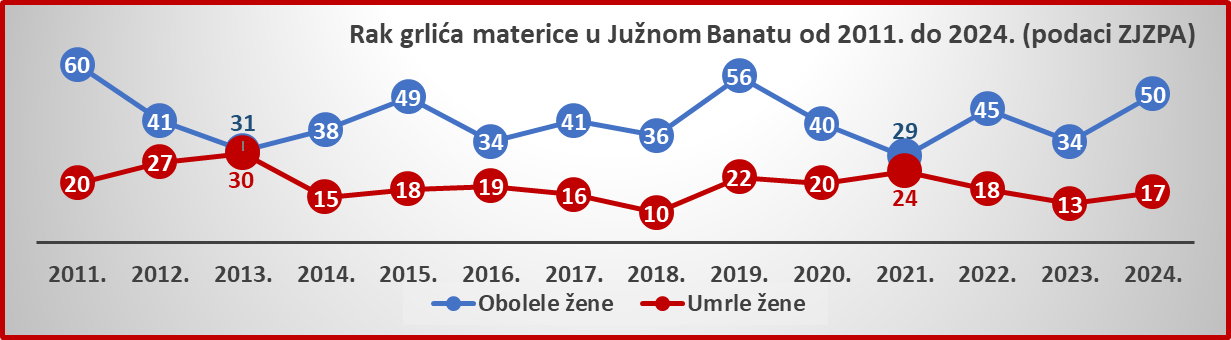 U odnosu na prethodne dve godine i u Pančevu i u Južnom Banatu povećan je broj i obolelih i umrlih (videti grafikone), ipak su za analizu upotrebljiviji podaci na petogodišnjem nivou. Za sada je jedino jasno da se situacija ne poboljšava, pa nam je i to pokazatelj da nam prevencija ne napreduje, čak ni kod žena koje su, za razliku od svojih baba ili majki, za ginekologa čule još u zabavištu. Novi stil života i okidači u životnoj sredini i hrani sigurno još dodaju rizike, što pokazuje i to što se bolest registruje kod sve mlađih uzrasta, sve češće i u dobi od 30 do 35 godina.