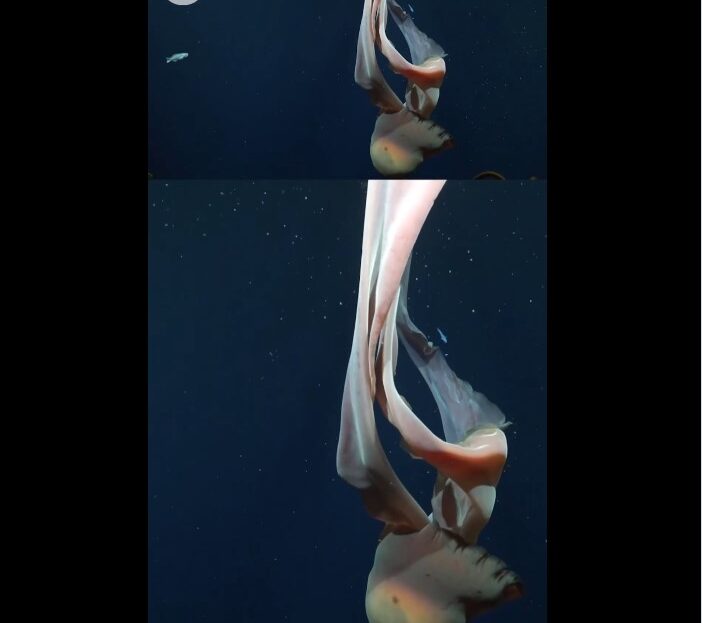 A team of researchers documenting the deep sea off the coast of Argentina discovered a jellyfish that can „grow as long a school bus.“ The footage shows a rarely seen giant phantom jellyfish at 820 feet below sea.