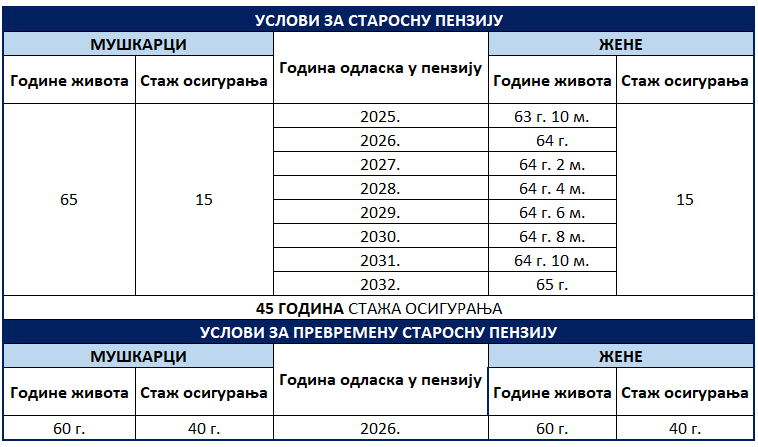 Vremena socijalnog blagostanja i kod nas se dobro sećaju oni koji se sada u Srbiji pripremaju za penziju ili koji sitno broje do nje. Radni vek za žene je 2002. produžen sa 55 na 60, a za muškarce sa 60 na 65 godina. Od 2015. počela je primena ravnopravnosti u ovom domenu, te se od tada svake godine starosna granica za žene povećava za po dva meseca, s ciljem da 2032. dostigne granicu od 65 godina.
