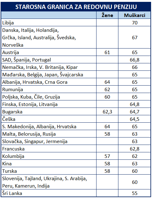 Za utehu možda može da nam bude to što Danci i Dankinje trenutno u penziju idu sa 67, a 2040. godine moći će da se penzionišu tek kada napune 70, a 2060. sa 74 godine. Čak se tome i raduju jer veliki broj njih ne želi da ode s radnog mesta. Verovatno i zato što im radna nedelja ne traje šest dana, a radni dan deset sati, s minimalcem, bez prevoza, toplog obroka… Pritom imaju i znatno duži životni vek nego mi u Srbiji, za oko deset godina. U ovoj zemlji najsrećnijih ljudi na planeti muškarci u proseku žive 80, žene skoro 84 godine, te u penziji uživaju 13, odnosno 17 godina. Istovremeno, muškarci u Srbiji će, prema trenutnoj statistici, u penziji provesti oko osam, a žene oko 14 godina. A da može i gore, neka nam posluži podatak iz Libije jer se tamo radi do 70, a prosečno se živi do 73 godine.