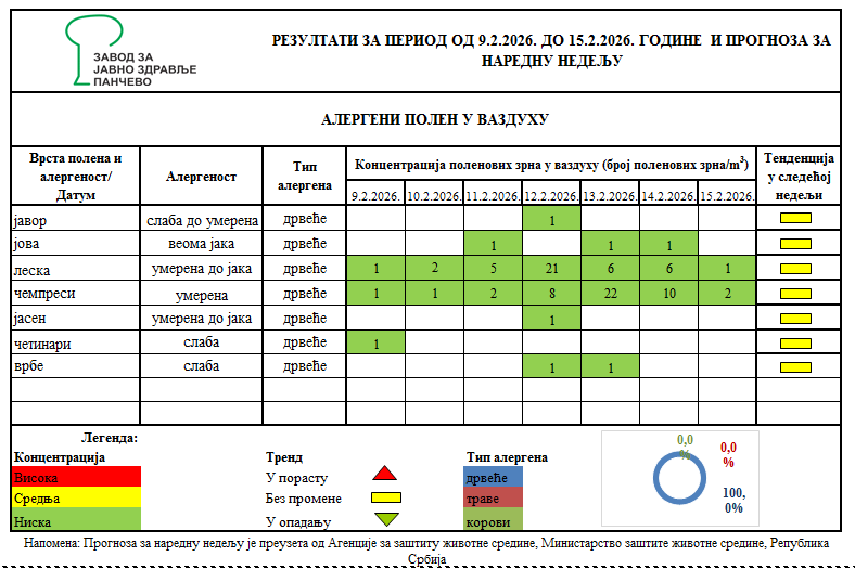 U sedmici od 9. do 15. februrara, u vazduhu Pančeva detektovane su niske koncentracije polena javora, jove, leske, čempresa, jasena i vrbe, pokazuju merenja Zavoda za javno zdravlje Pančevo..