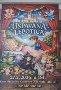 U Domu kulture Kačarevo večeras predstava za decu „Uspavana lepotica“. Početak predstave je u 18 časova, u Velikoj sali Doma omladine Kačarevo (Maršala Tita 13). Ulaz je besplatan.