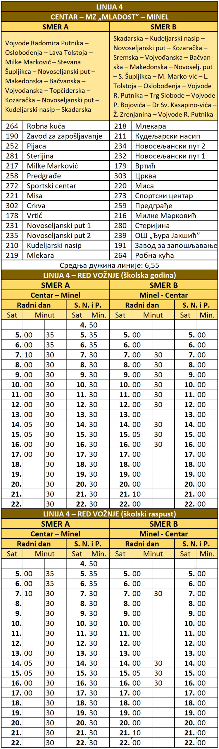 Linija 4 saobraća na ruti između centra grada, preko naselja „Mladost”, to jest Mise, do Minela. Autobusi kreću u 5.00 ujutru, to jest u 4.50 vikendom i przanikom iz centra, a poslednji polazak iz centra je u 22.30, to jest u 22.00 od Minela. Redovi vožnje se razlikuju u odnosu na trajanje školske godine.
