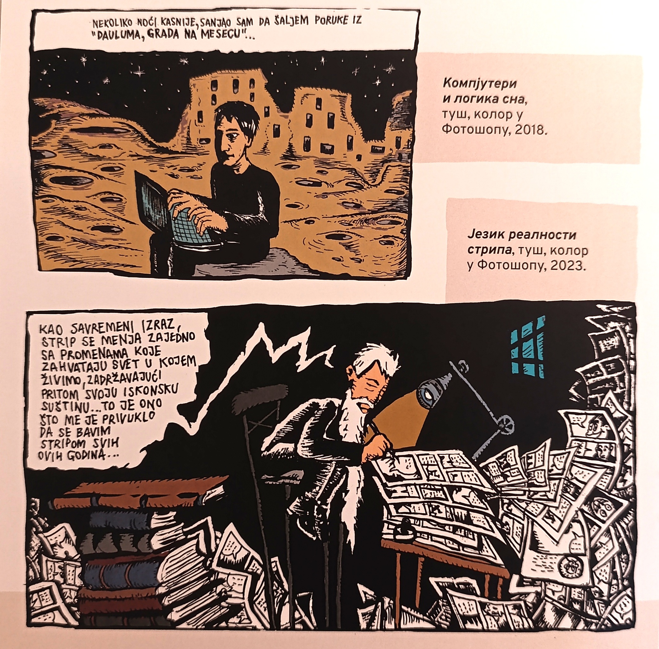 – Moj ceo život je umetnost. I sada, kada se budem vratio s ove konferencije, ja ću ponovo crtati. To je nešto što nema ni početka ni kraja, a ovaj jubilej označava u stvari samo početak objavljivanja mojih radova. Pančevačka izložba će biti uvod u veliku retropsektivnu izložbu u maju u Muzeju primenjenih umetnosti u Beogradu. Ali ništa se neće završiti s jednom izložbom, moje stvaranje će trajati dok budem mogao da držim olovku u ruci. Moje stvaranje je deo življenja, ne samo posledica nekog trenutnog eksperimenta ili traženja ili nastojanja da se pronađe umetnički izraz. Kako se probudim pa do kasno u noć ja ili pripremam stripove, radim na svojim stripovima, ili pišem scenarije, ili ih crtam. Uspeo sam ipak, zajedno sa Ivanom, da taj moj raznorodni rad nekako uobličim u izvestan pregled. Nešto od toga je nastajalo i u saradnji s Kulturnim centrom Pančeva, za koju i ne znam kada je počela ni kada će se završiti. Pretpostavljam da je to jedna osmica koja kruži kroz ovaj mali lokalni kosmos – bile su reči kojima je Zograf najavio svoju izložbu na konferenciji za novinare.