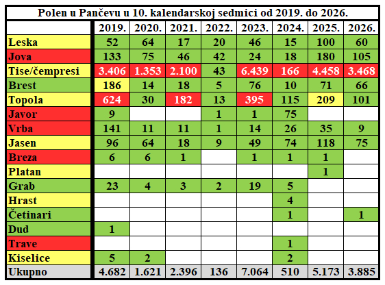 Ove godine ipak je u 10. kalendarskoj sedmici manje polena u odnosu na 2025. Pregled merenja Zavoda za javno zdravlje govori da je kasna zima najviše pogodovala cvetanju drveća 2023. Tada je u jednom kubnom metru izmereno skoro 6.500 čestica polena čempresa i tise, drveća kojima očigledno obiluju Pančevo i okolina. Takođe, ukupno je više polena bilo skoro duplo više nego u ovoj sedmici.