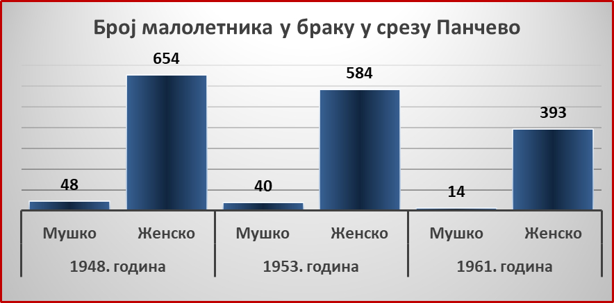 Da su praktično devojčice u većem broju te koje su maloletne ulazile u brak, tvrdio je i „Pančevac” u tekstu „Borba protiv zaostalosti – brak maloletnika” od 24. januara 1953, kao i da „takva pojava češće zahvata sela nastanjena Rumunima”. Ali da ipak Rumuni nisu bili krivi za sve, govori statistika, iako treba imati u vidu da je bitan i broj pripadnika u jednoj naciji. Prema odluci Sreskog suda, u 1952. je odobren brak ukupno 58 maloletnih devojaka i sedam maloletnih mladića, od kojih kod Rumuna 15, Slovaka 14, Mađara 12, Srba 21 i Bugara tri. A iza ovih brojki bili su skriveni i neregistrovani brakovi, što pominje i „Pančevac”. Anonimno nam je ćerka jedne Rumunke iz Banatskog Novog Sela svedočila da je njena majka sa 15 godina „otišla iz kuće”, ne svojom voljom, da bi brak pred državom zvanično bio sklopljen tek kada je i ona napunila 18 godina.