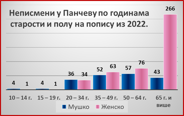 Napredovanje je ipak išlo sporo, na sreću, brže kod žena. Osim krivulje u grafikonu o broju nepismenih od 1948. do 2022, koja se mnogo brže spušta kada su žene u pitanju, o tome govori i podatak o strukturi nepismenih s poslednjeg popisa. Žene koje ne znaju da čitaju i pišu imaju uglavnom iznad 65 godina, što znači da su najkasnije bile rođene pre 1960. godine. U Pančevu je nepismenost kod oba pola kod mlađih od 19 godina skoro iskorenjena. Ali ako ništa drugo, radi pobedničkog ženskog mentaliteta mogli bismo istaći da je od ukupno 10 nepismenih u tom uzrastu osam muškaraca, ili pet puta više nego žena.