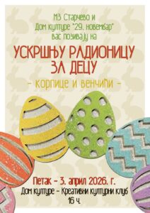 Uskršnja radionica za decu biće priređena u petak, 3. aprila, od 16 sati u Domu kulture „29. novembar“ u Starčevu, u prostorijama Kreativnog kulturnog kluba.