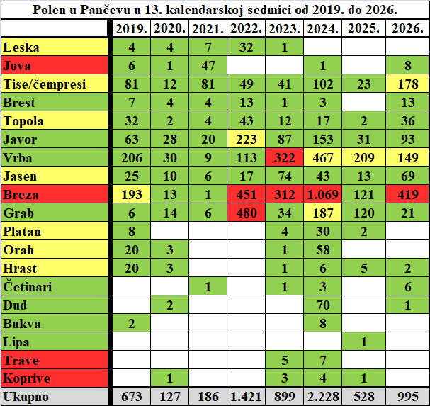 Sudeći prema poređenju koncentracija polena u Pančevu u poslednjih osam godina, na osnovu merenja Zavoda za javno zdravlje, vremenski uslovi sve više pogoduju sve ranijem cvetanju breze. Za 13. sedmicu u godini takođe je karakteristično i vrlo intenzivno cvetanje vrbe: A jove, koji kao i breza ima jedan od najagresivnijih polena, kako merenja pokazuju, srećom u Pančevu nema mnogo.