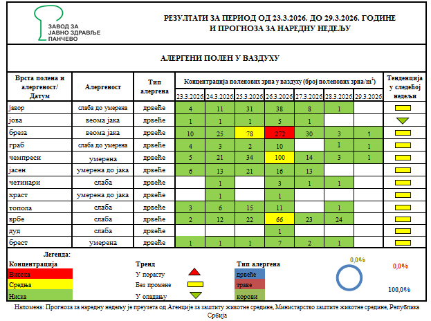 U 13. kalendarskoj nedelji, od 23. do 29. marta, u vazduhu Pančeva detektovane su visoke koncentracije polena breze i srednje koncentracije polena čempresa i vrbe, izveštava pančevački Zavod za javno zdravlje.