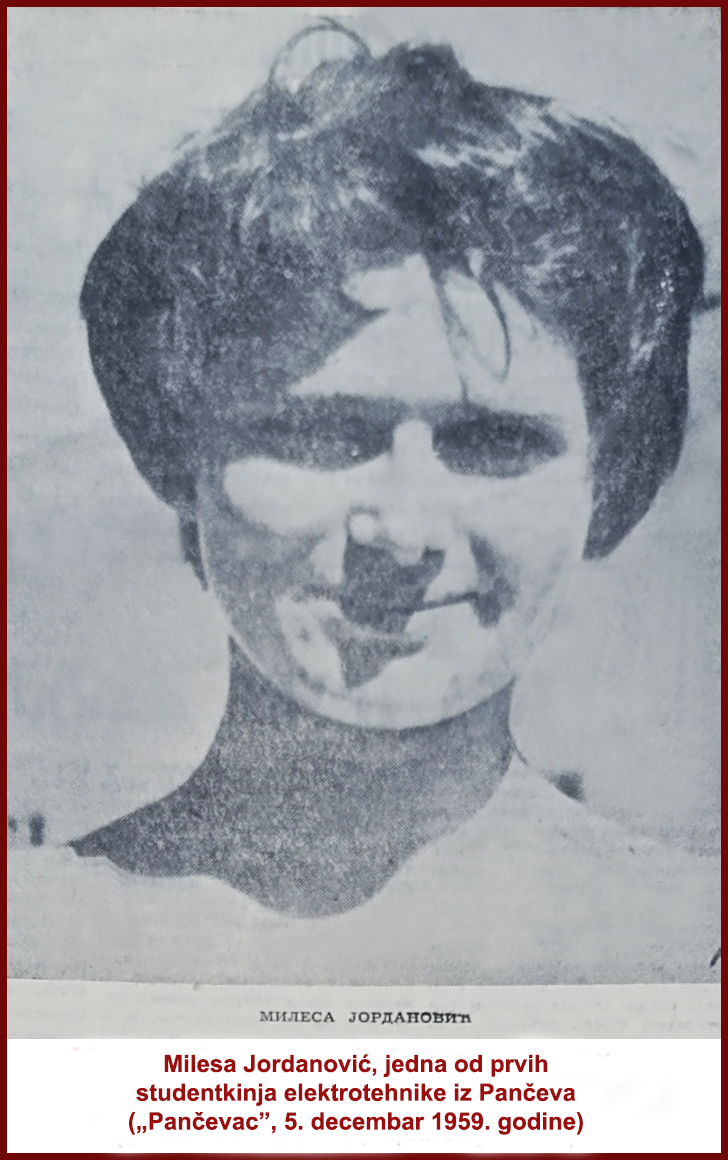 I najzad, u broju od 5. decembra junakinja jednog teksta u „Pančevcu” biće i jedna studentkinja tehnike, doduše pod čudnim naslovom „Hej čoveče, buntovniče!”, za koji nismo dobili nikakvo objašnjenje. Reč je bila o Milesi Jordanović, briljantnoj učenici Gimnazije, čiji je maturski rad iz srpskohrvatskog jezika proglašen za najbolji na području čitave tadašnje Jugoslavije na konkursu lista „Mladost”. Usput, bila je prvak škole u skoku udalj, aero-modelar, dva puta udarnik na radnim akcijama.., da bi na kraju na Beogradskom univerzitetu upisala elektrotehniku. A takvih je, po popisu iz 1953. godine, bilo samo sedam iz Pančeva. Naravno, ni za Leposavu ne znamo da li je bila sa sela ili ne – valjda i zato što to ne bi trebalo da bude bitno.