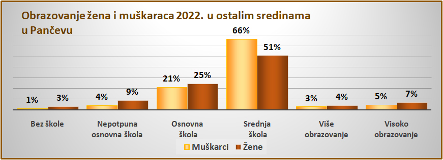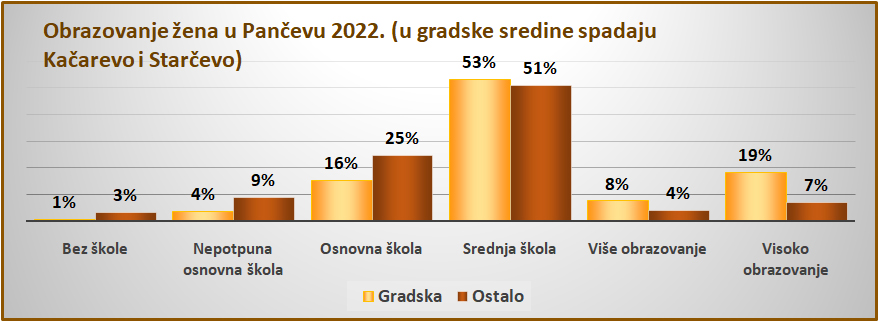 Da i u selima, to jest „ostalim sredinama” kako se u statistici nazivaju, žene sve više šansu vide u školovanju, svedoči i to što su i one, po popisu iz 2022, prešišale muškarce po najvišem obrazovanju – u odnosu na svoju populaciju sedam odsto ima diplomu neke visoke škole, a muškaraca svega pet odsto. Pri čitanju naših grafikona treba imati u vidu da se u „gradske sredine” računaju, pored grada, i Starčevo i Kačarevo, a da u „ostale sredine” spadaju Glogonj, Jabuka, Omoljica, Banatsko Novo Selo, Banatski Brestovac, Ivanovo i Dolovo.