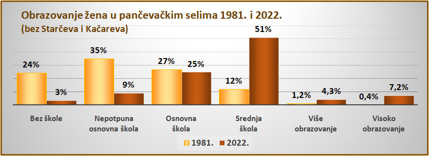 Istina je, doduše, da i danas ima više nepismenih žena nego muškaraca i u gradu i po selima Pančeva, ali to je samo zahvaljujući starijoj generaciji. Iako je o tome malo ko zborio, a gradski medij nikako, sudeći po podatku iz statistike i u dobi od 35 do 49 godine i dalje ima više nepismenih žena nego muškaraca, te je jasno da su se manje školovale i tokom sedamdesetih i osamdesetih godina, a na samo sredinom prošlog veka (videti grafiku). Sudeći bar po nepismenima, situacija se promenila tek pred kraj prošlog veka, jer će popis iz 2022. godine konstatovati da je broj nepismenih žena manji tek u dobi od 20. do 35. godine, to jest da je reč o generaciji koja je rođena posle 1985. godine. Istovremeno, kako se smanjivala nepismenost, žene su osvajale sve više i najviše stepenice u obrazovanju.