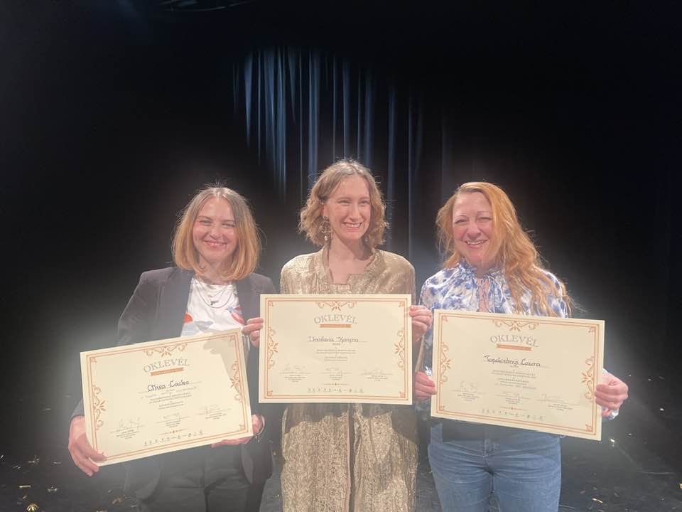 Nagrade za tri sjajne umetnice koje stoje iza predstave „Jednorog”: Alisa Lacko, Anastasia Kargina i Laura Topolčanji Foto: FB/SrpskopozoristeuMađarskojFoto: Srpsko pozorište u Mađarskoj